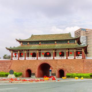 迎恩门,位于东莞市莞城街道西正路,在唐代土墙基础上于明洪武十七年(1384)重建,位于彼时东莞城西,民间故称“西城门”“西城楼”,明、清两代均有重修和扩建。原城墙与道家山、钵盂山、东(和阳)门、南(崇德)门、北(镇海)门三座城门相连,城外有壕沟,形成了完整的防御工事体系,共同守护城内百姓。