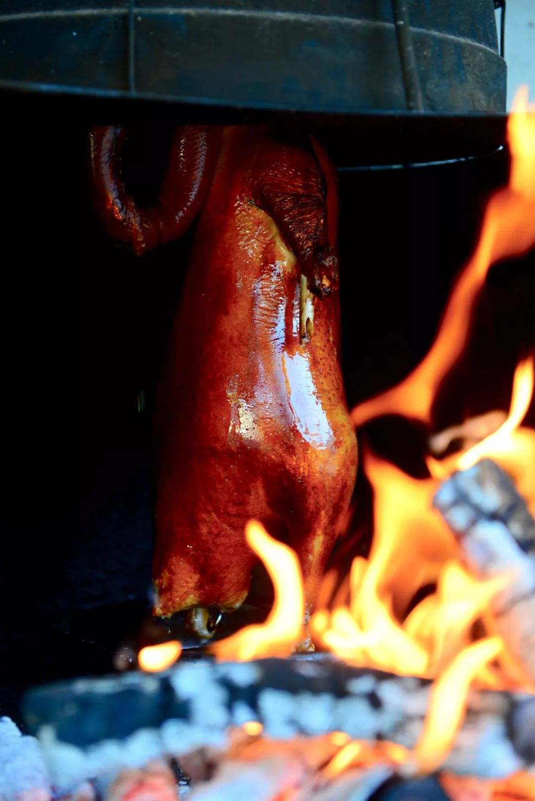 用放上一整年足够干燥的荔枝柴把火烧旺,从养足 80天以上的清远黑鬃鹅中,细细挑选一只5到8斤的鹅,去掉翼、脚、内脏,经过一番吹气、涂五香八角调料、缝肚、滚水烫皮,糖皮匀皮、腌制步骤后,挂在烤炉内烧烤。