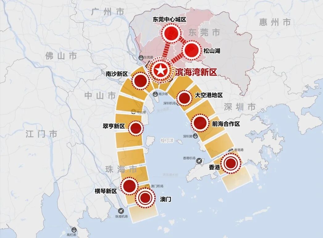 这个内湾,环珠江口100公里,三面环陆,一面向海。由深圳前海、东莞滨海湾新区、广州南沙、中山翠亨新区、珠海横琴新区共同组成。
