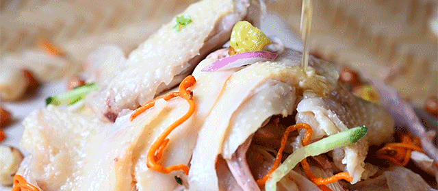 不以重口调料掩盖鸡肉本身的鲜味,上桌后拌上常蘸的葱丝、花生、洋葱、香菜、芝麻...等等配料,还有少见的虫草花…更能突显肉质的鲜嫩。也可以根据自己的口味来进行捞起,把喜欢的配菜放到鸡肉里,一顿搅拌后入口,味道层次丰富,真是“捞乜都掂”!
